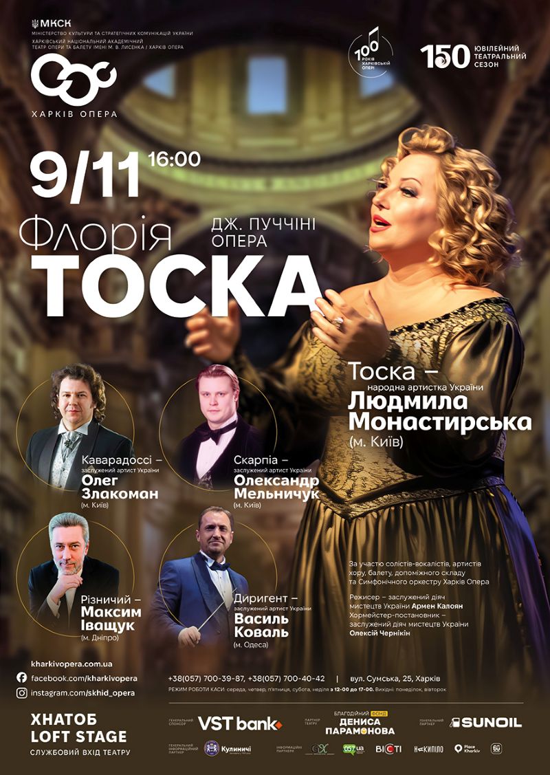 9 листопада о 16:00 «Харкiв Опера» представляє оперу Джакомо Пуччіні «Флорія Тоска».