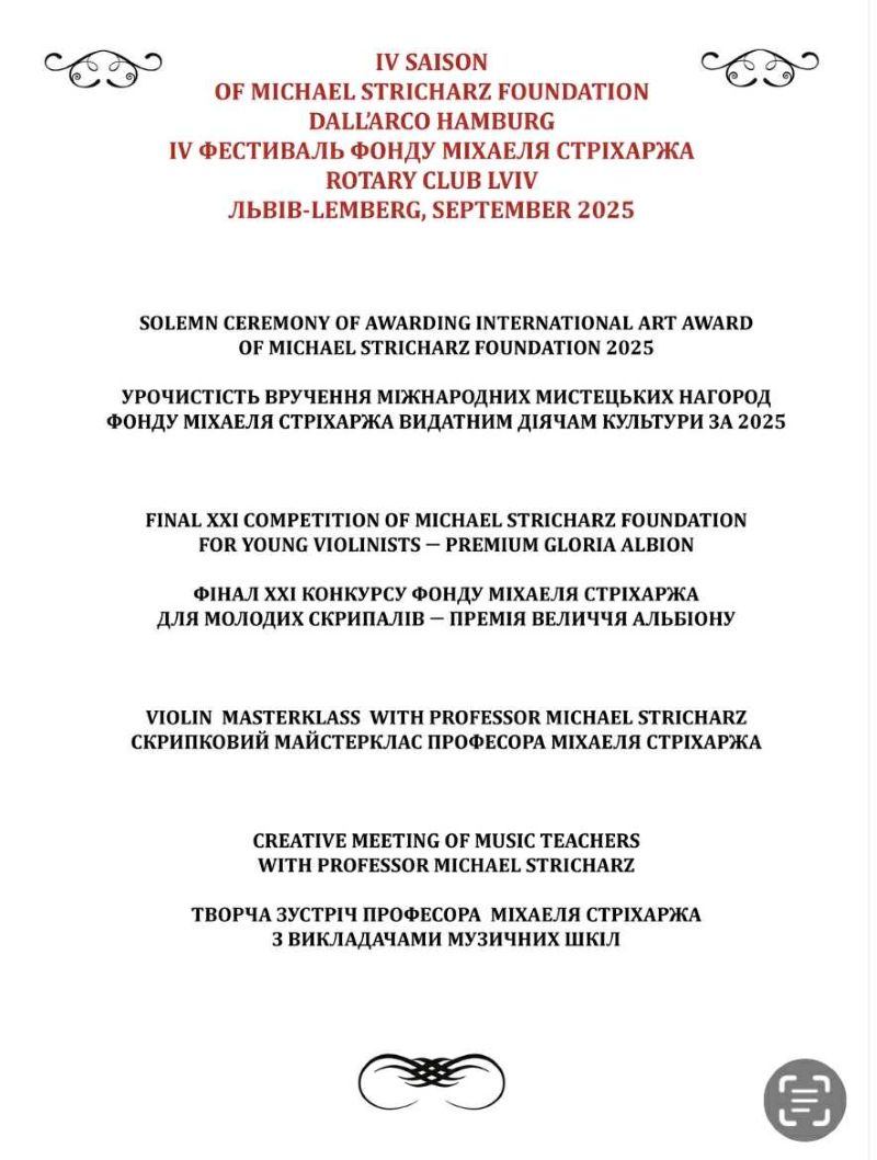 Цьогорічний приїзд маестро до Львова також включав кілька складових. Відкриттям урочистостей IV Фестивалю Фонду Міхаеля Стріхаржа («IV. Saison of Michael Stricharz Foundation Dall’Arco Hamburg in Ukraine, Lviv 2025») 21 вересня в музеї Олекси Новаківського стало вручення німецьких міжнародних мистецьких нагород за 2025 рік від цього фонду.