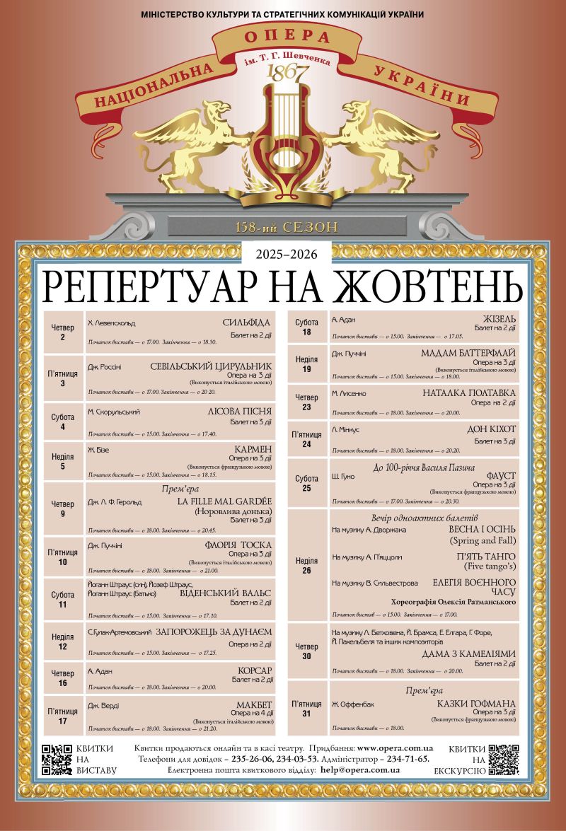 23 жовтня (четвер) о 18:00 – перлина українського оперного мистецтва «Наталка Полтавка» Миколи Лисенка. Музична редакція Мирослава Скорика.