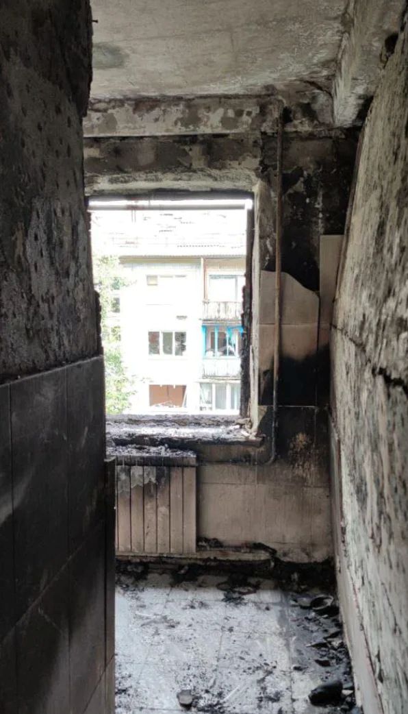 На фото з імовірно квартири юристки видно, що приміщення повністю згоріло, стіни між кімнатами на межі руйнування, а від ремонту лишилося лише декілька розбитих плиток на стіні.