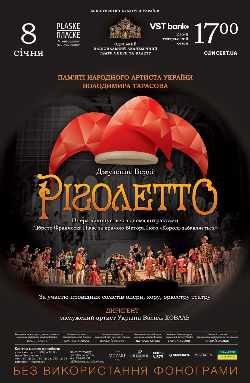 Тож, 8 січня Одеській національній опері - «Ріголетто» Дж. Верді, що присвячується українському оперному співаку, педагогу, народному артисту України Володимиру Тарасову.
