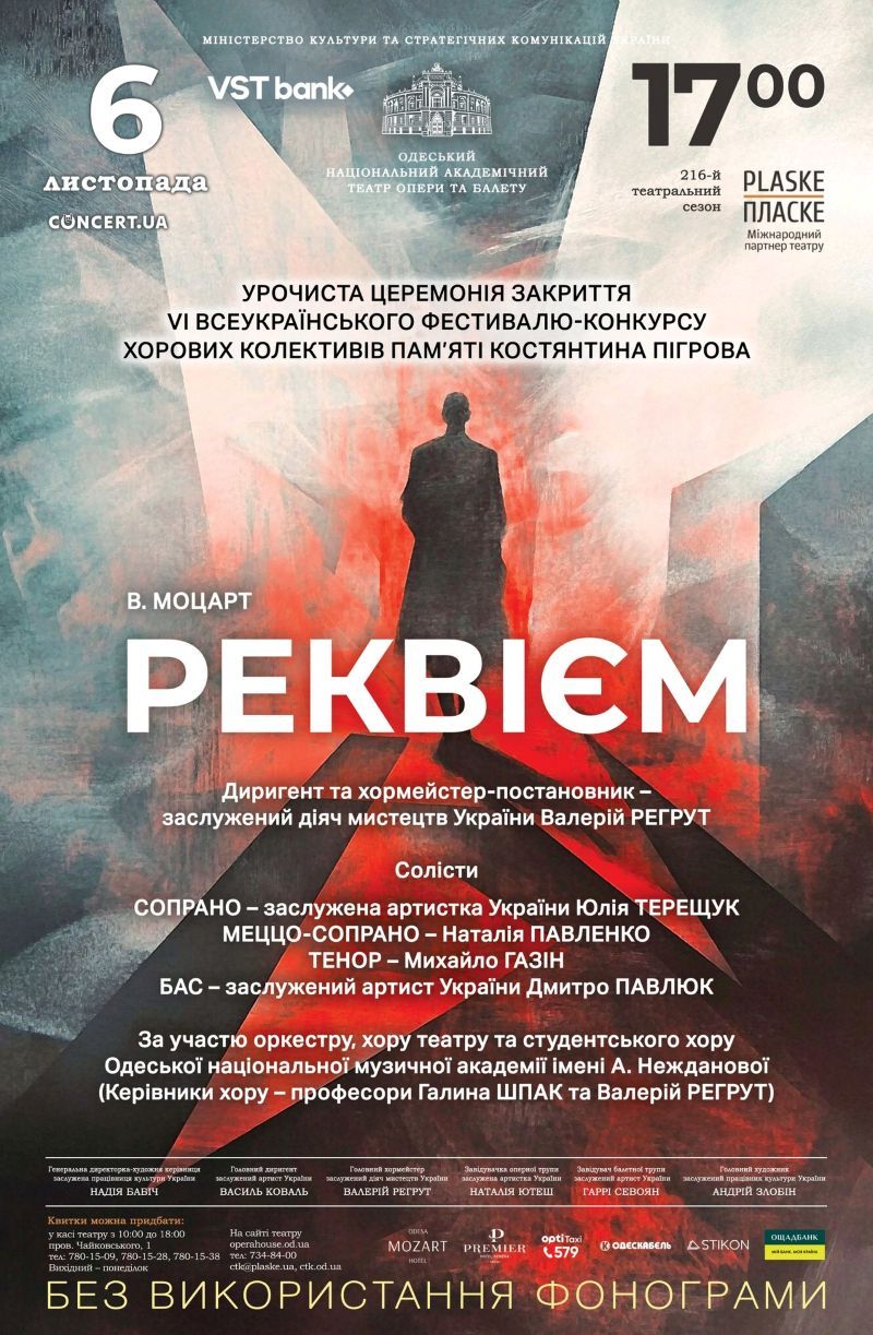 Вже 6 листопада в Одеській національній опері заключним акордом насиченої, потужної програми хорового форуму зазвучить «Реквієм» В.- А. Моцарта. У супроводі оркестру театру під орудою заслуженого діяча мистецтв України Валерія Регрута прозвучить цей величний твір у виконанні провідних солістів опери, хору театру та хорового колективу Одеської національної музичної академії ім. А. Нежданової.